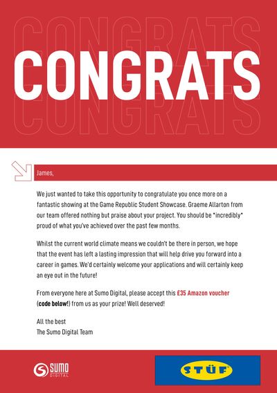 Back in 2020 I was super grateful to receive a reward at the Game Republic Student Showcase for SUMO Digitals Game Design award despite having to work during the pandemic. It was an honour and I hope to go on winning awards like this in future!