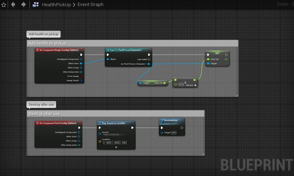 This is the very simple blueprint for my health pickup that I created in a day. The logic for this is very simple as it only has to cast to the ThirdPersonCharacter1 and add to the life number.